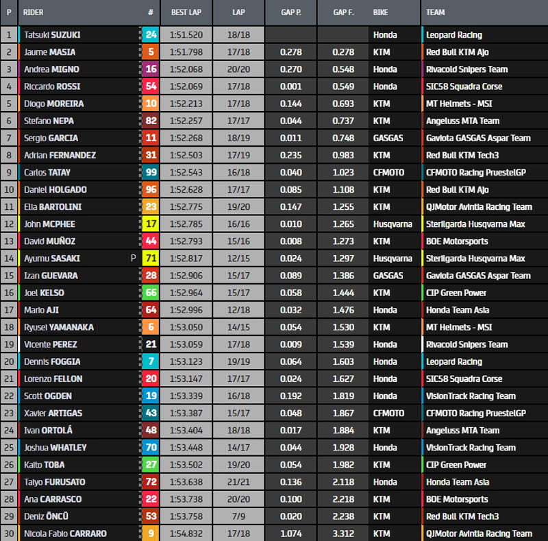 Jaume Masiá (Red Bull KTM Ajo) vient s’intercaler entre les deux leaders dans les 5 dernières minutes mais le pilote japonais du team Leopard Racing en rajoute une couche, en 1’51.520 dans son dernier tour.