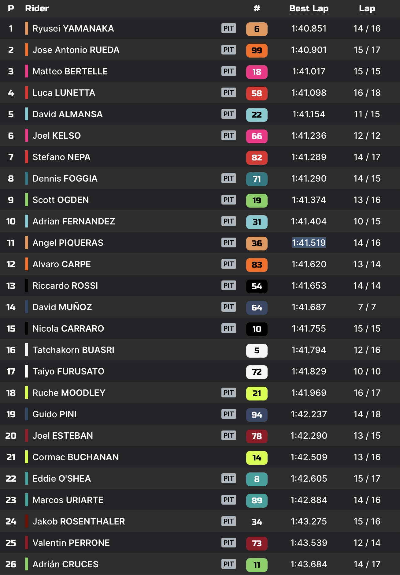 José Antonio Rueda améliore significativement sa meilleure marque personnelle en toute fin de séance, signant un temps en 1:41.041. Il sera cependant battu par la marque en 1:40.981 de Ryusei Yanamaka. Le Japonais ayant bouclé un tour du circuit de Buriram en 1:40.900, lors de sa troisième tentative. Il fera encore mieux lors de la quatorzième, améliorant le chrono de référence de 50 millièmes. Il est ainsi le premier à évoluer sous la minute 40.