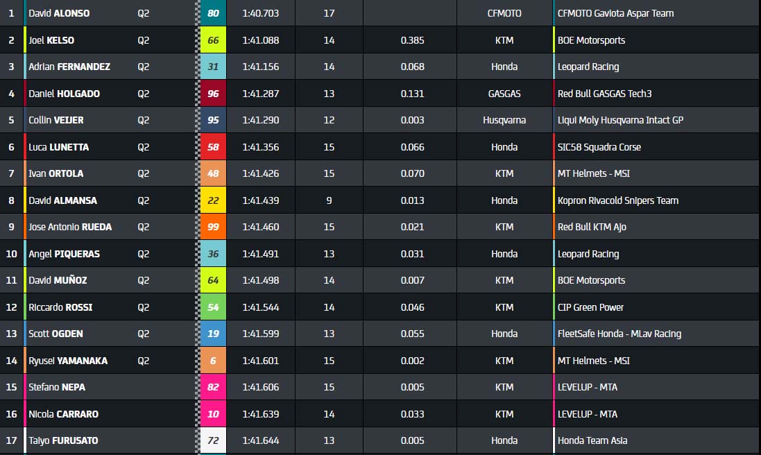 Veijer, déjà premier, améliore son chrono, mais il est seul en piste à sept minutes de la fin. Puis, tous les pilotes s’agitent. Adrian Fernandez passe deuxième, juste devant David Munoz. Dans ce rush final, petite chute pour Matteo Bertelle (Honda Snipers Team).