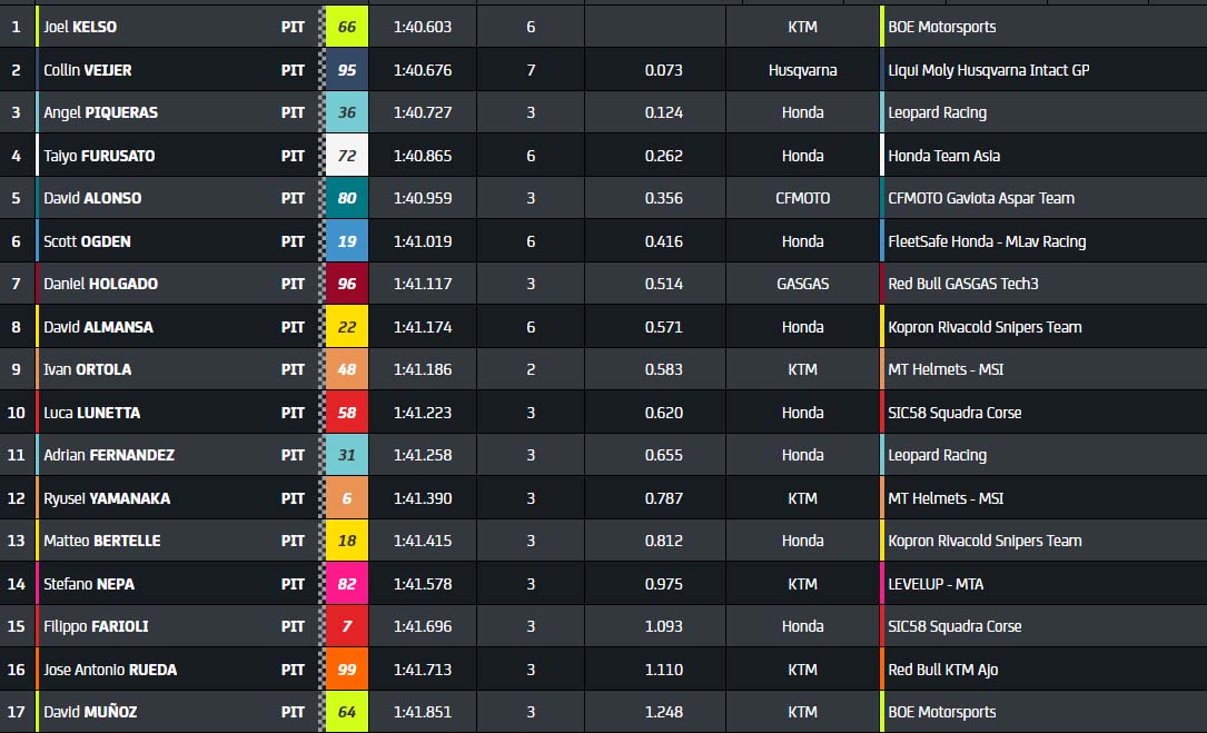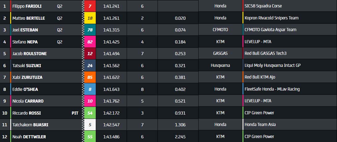 Au terme d’une Q1 très calme, Filippo Farioli réalise le meilleur tour, et rejoint la Q2 accompagné de Matteo Bertelle, Joel Esteban et Stefano Nepa (KTM LEVELUP MTA). Jacob Roulstone est le premier éliminé.