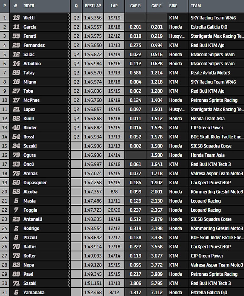 Ce matin, Masiá, Suzuki, Toba, López, Arbolino, Migno, McPhee, Antonelli, Vietti, Rodrigo, Rossi, Dupasquier, Salač et García se sont pré-qualifiés pour la Q1.