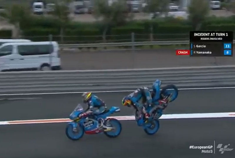 Alonso López (Husqvarna, Sterilgarda Max Racing Team) prend le relais en 1’49.019 quand un incident très spectaculaire survient entre les deux coéquipiers du team Estrella Galicia 0,0, Sergio García et Ryusei Yamanaka: le premier plante les freins en bout de ligne droite juste devant le deuxième qui, peut-être avec l’aspiration, ne peut pas éviter la collision. Le pilote japonais est évacué sur une civière mais se relève rapidement.