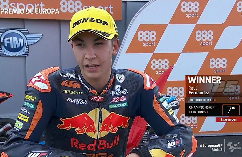 Raúl Fernández (1er) : « C’est incroyable, nous attendions vraiment d’avoir ce feeling. Mon premier podium était incroyable mais là c’est le plus beau jour de ma vie. Je souhaite remercier ma famille, qui est restée à la maison, et mon équipe. Je dois revoir la course parce qu’à la fin j’avais un petit problème avec la moto donc il faut regarder les données. Mais merci, c’est incroyable. »