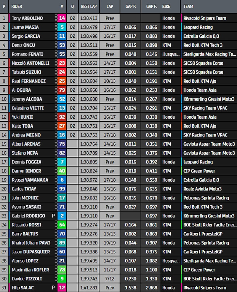 Ce matin en FP1, Tony Arbolino (Honda, Rivacold Snipers Team) a inscrit un nouveau record du circuit en 1’38.413 devant Deniz Öncü (KTM, Red Bull KTM Tech3), Romano Fenati (Husqvarna, Sterilgarda Max Racing Team) et Jeremy Alcoba (Honda, Kömmerling Gresini Moto3) alors que le leader du championnat Albert Arenas (KTM, Aspar Team Gaviota) et son principal adversaire Ai Ogura (Honda, Honda Team Asia) se sont positionnés 12e et 13e.