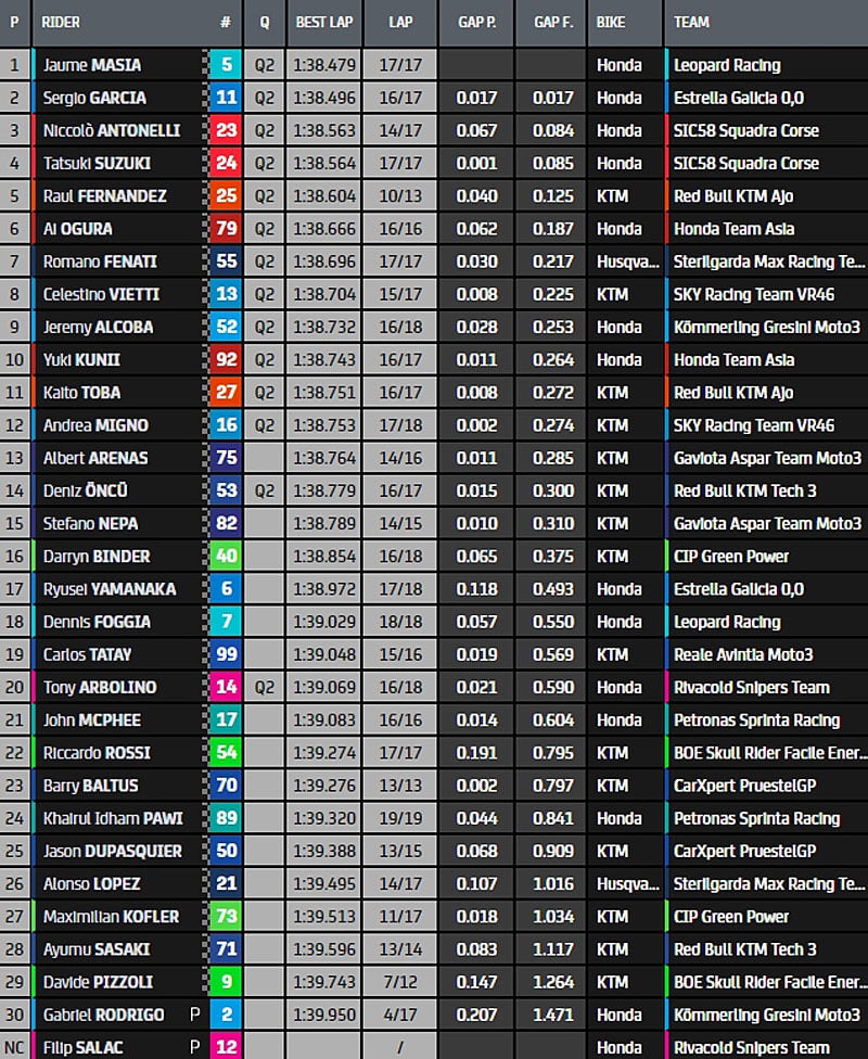 Tatsuki Suzuki (Honda, SIC58 Squadra Corse) et Deniz Öncü (KTM, Red Bull KTM Tech3) intègrent le top 10, tout comme Darryn Binder (KTM, CIP–Green Power) qui aboutit à la 2e place. Cela profite au coéquipier de ce dernier, Maximilian Kofler, qui, dans sa roue, remonte en 10e position.