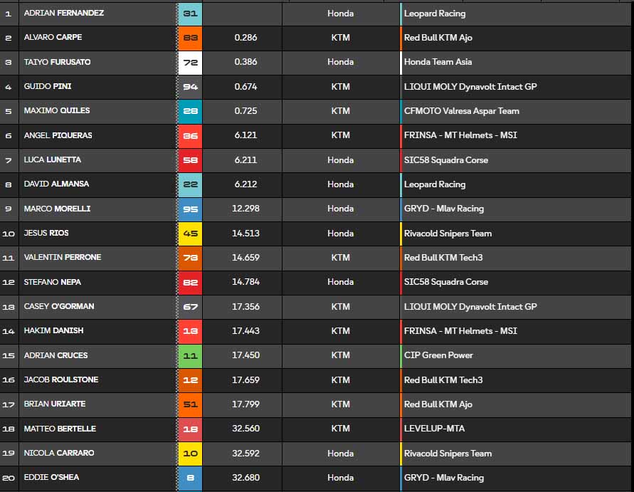Le problème, c’est que dans le dernière tour, Furusato est passé par la partie verte ! Il perd donc sa deuxième place au profit d’Alvaro Carpe et passe donc troisième. Quiles, cinquième devant Piqueras, ne peut pas lui ravir la deuxième place du classement général. Il a tout de même réalisé une magnifique saison pour un rookie, c’est à n’en pas douter.