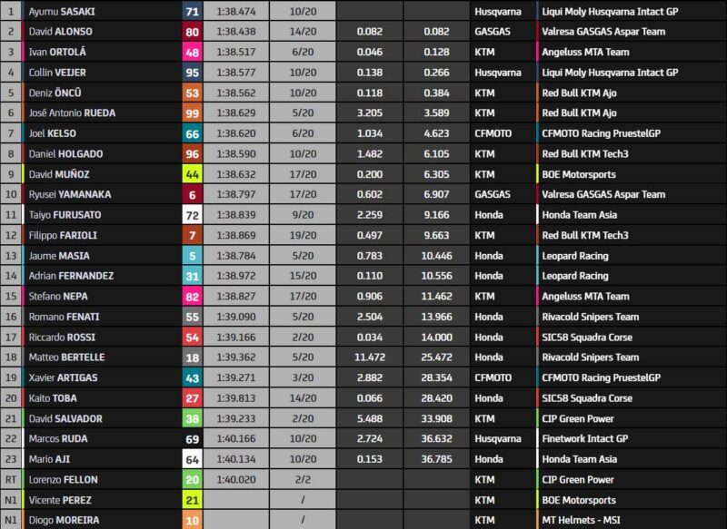 Le Turc connait quelques problèmes, peut-être à cause de sa grosse chute de vendredi. Le pilote Red Bull KTM Ajo galère un peu, attention à lui ! Le groupe de tête n’est plus composé que de quatre pilotes, à savoir Collin Veijer, Ayumu Sasaki, David Alonso et Ivan Ortola.