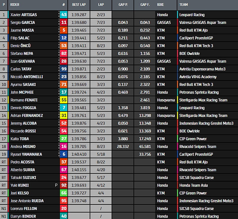 Alors qu’il ne reste déjà plus que 10 tours, les 12 premiers pilotes ont pris un peu d’avance sur leurs poursuivants. Pedro Acosta (KTM, Red Bull KTM Ajo, #37) se démène pour rester en tête, devant Xavier Artigas (Honda, Leopard Racing, #43) et Deniz Öncü (KTM, Red Bull KTM Tech3, #53). Les pilotes sont de plus en plus nombreux à être avertis pour dépasser les limites de la piste.