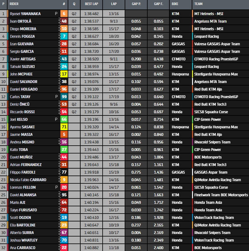 Fin de séance : Yamanaka termine devant Ortola, Moreira, Foggia, Guevara, Garcia, Artigas, Suzuki, McPhee, Salvador, Hokgado, Tatay, Oncu et Rossi. ils sont ainsi les 14 pilotes qualifiés pour la Q2