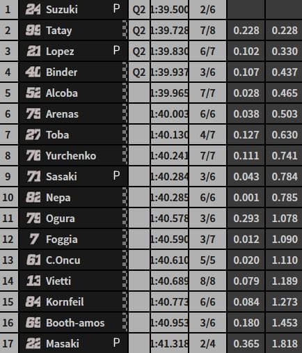 Lors des derniers instants, Suzuki restait le plus véloce en 1’39.500. Les quatre qualifiés étaient Suzuki, Tatay, López et Binder.