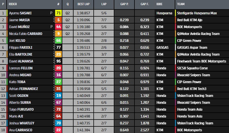 Fin de séance et les 4 pilotes qualifiés pour la Q2 sont : Sasaki, Masia, Munoz et Carraro
