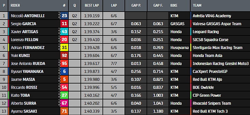 A l’issue de cette Q1, ce sont Niccolò Antonelli (KTM, Reale Avintia, #23), en 1’39.159, Sergio Garcia (GasGas, Aspar Team Moto3, #11), Xavier Artigas (Honda, Leopard Racing, #43) et Lorenzo Fellon (Honda, SIC58 Squadra Corse, #20) qui se qualifient en Q2. Jaume Masià (KTM, Red Bull KTM Ajo, #5) rate la Q2 car il est passé dans la bande verte et son dernier chrono n’est pas valide.