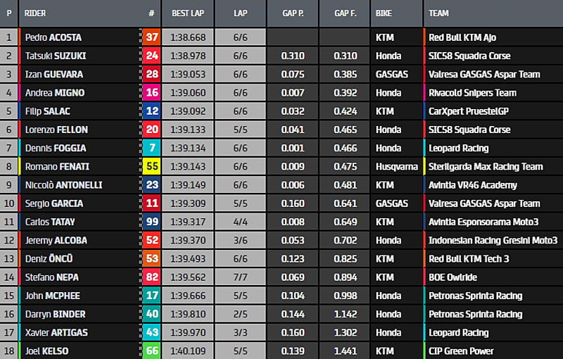 A mi séance, alors que la plupart des pilotes sont rentrés aux stands, Izan Guevara (GasGas, Gaviota Aspar Team, #28) n’a pas amélioré et serait en pole position avec son chrono de 1’39.223, accompagné en première ligne d’Andrea Migno (Honda, Rivacold Snipers Team, #16) et Dennis Foggia (Honda, Leopard Racing, #7).