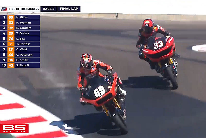 A la mi-course, les deux Harley-Davidson sont détachées en tête avec un avantage de 8 dixièmes, Kyle Wyman toujours en embuscade derrière Hayden Gillim.
