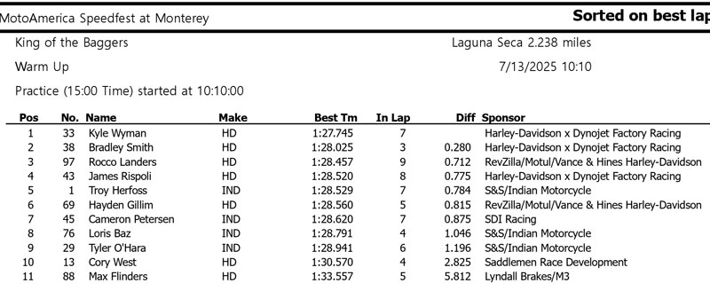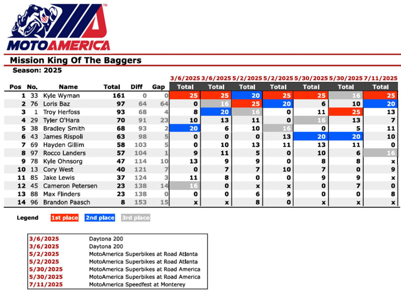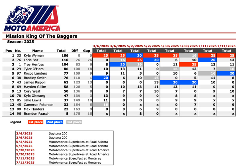 Au terme du samedi du quatrième rendez-vous du championnat MotoAmerica King of the Baggers 2025 à Laguna Seca, le leader du championnat Kyle Wyman (Harley-Davidson x Dynojet Factory Racing) a fait passer son avance au classement général de 56 points sur le champion en titre Troy Herfoss (S&S/Indian Motorcycle) à 64 unités sur Loris Baz (S&S/Indian Motorcycle).