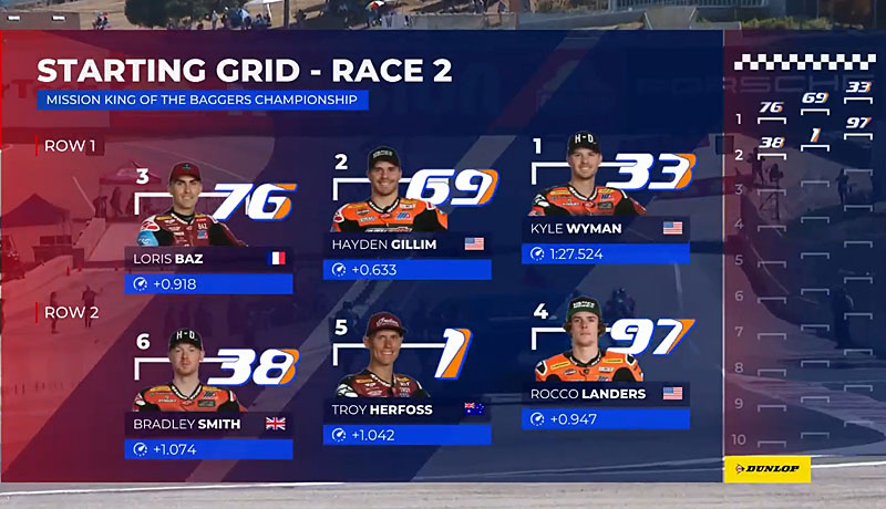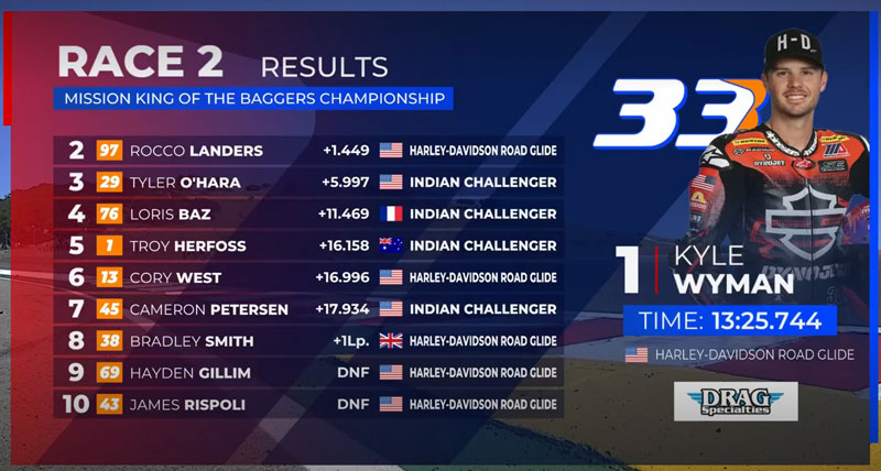 Avant de quitter le WeatherTech Raceway, nom actuel du légendaire tracé californien construit en 1957, la deuxième course de 9 tours des Baggers n’avait donc d’autre enjeu que de désigner le chef de file chez Indian, Kyle Wyman étant de toute façon hors de portée au classement général.