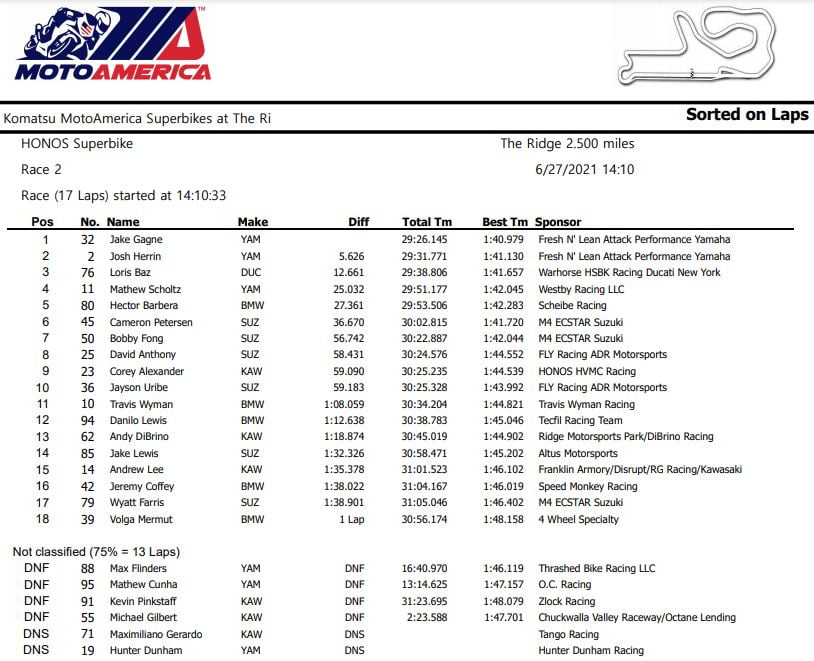 Résultats de la Course 2 du Superbike au Ridge Motorsports Park :