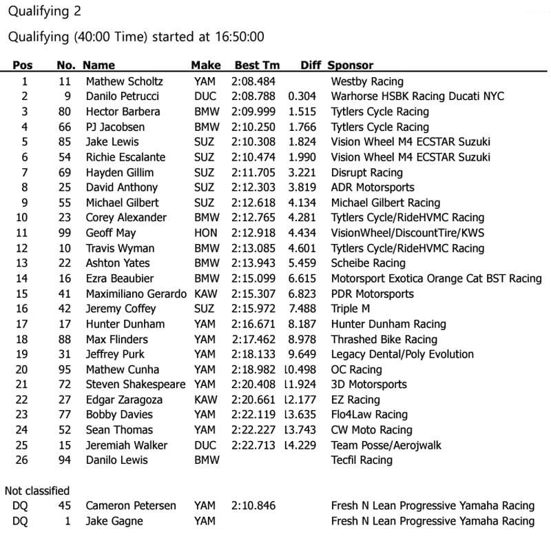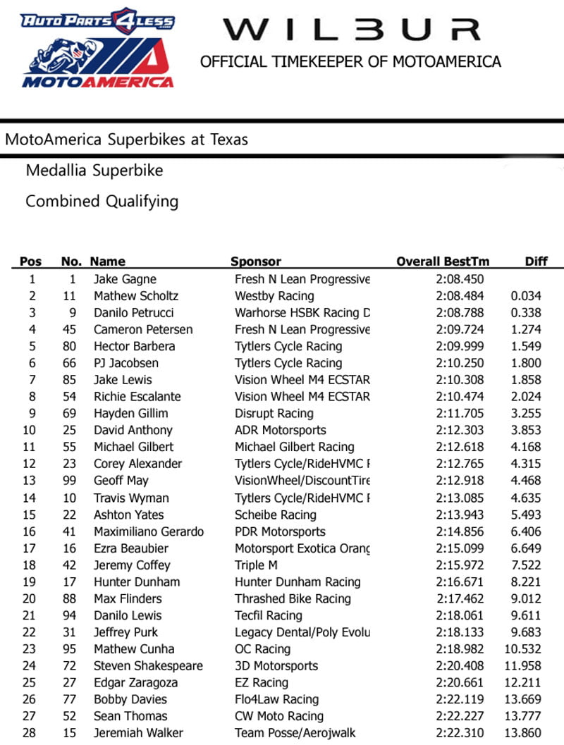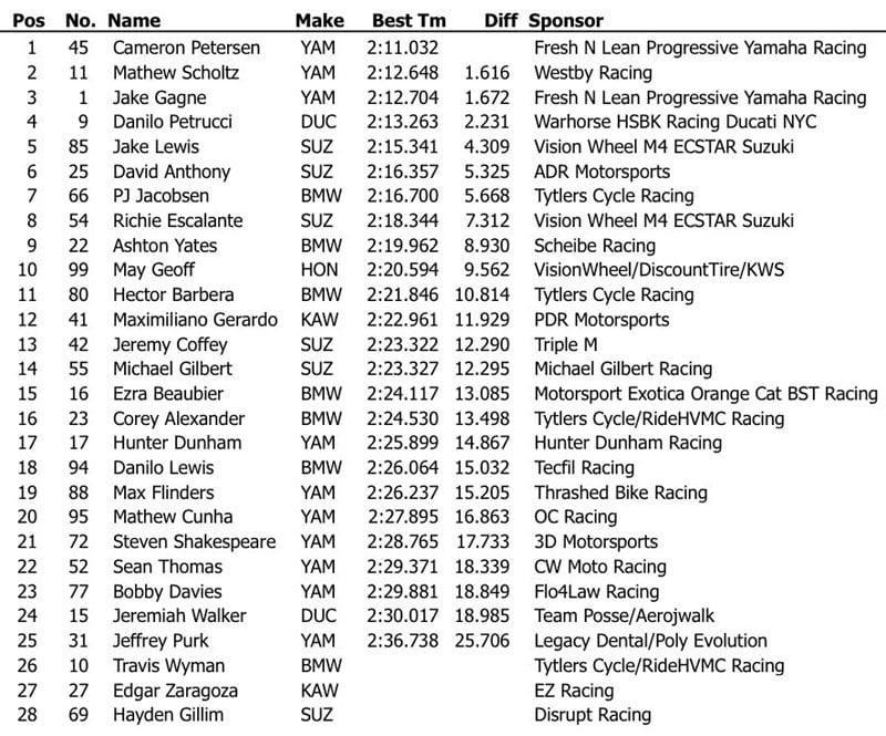 Lors de l’unique séance d’essais libres, tout le monde a pris ses marques sur le circuit des Amériques et, de façon logique, on a retrouvé les têtes d’affiche en haut du classement, à commencer par un trio de Yamaha emmené par un Cameron Petersen promu chez Fresh N’ Lean Progressive Yamaha Racing, Mathew Scholtz (Westby Raccing) et l’incontournable Jake Gagne (Fresh N’ Lean Progressive Yamaha Racing) devant l’inconnu du jour, Danilo Petrucci sur sa Ducati Warhorse HSBK Racing Ducati New York.