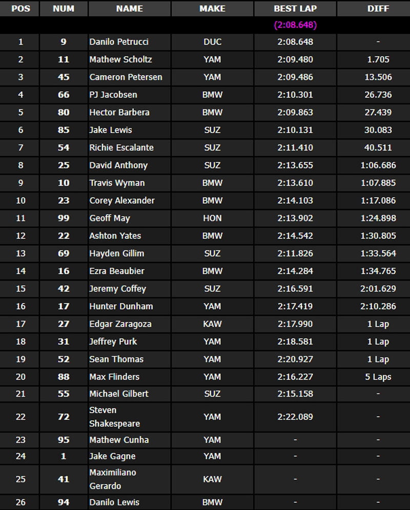 Danilo Petrucci, toujours pas en grande forme physique depuis ses blessures au Rallye Dakar, devient le 63e pilote de l’histoire à remporter une course AMA Superbike. Il est également le troisième Italien à s’imposer, après Alessandro Gramigni et Zanetti, tous sur Ducati.