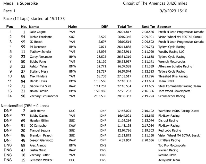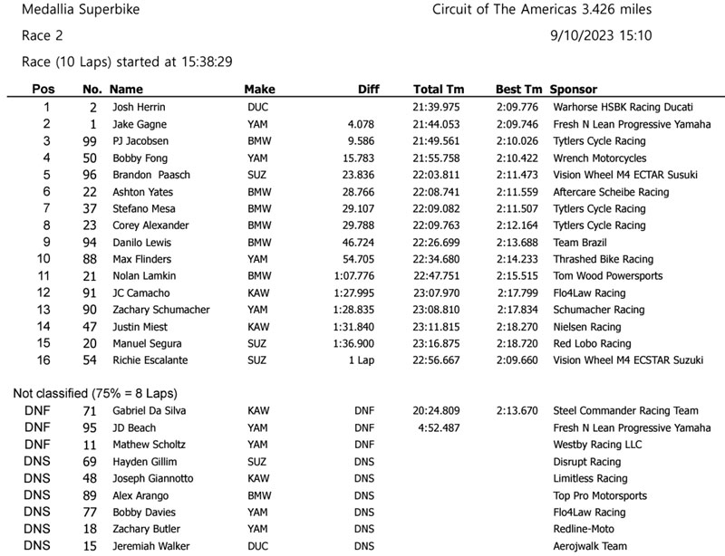 Une victoire en course acquise devant le Mexicain Richie Escalante (Vision Wheel M4 Ecstar Suzuki) et JD Beach, le coéquipier de Jake Gagne chez Fresh N Lean Progressive Yamaha Racing en remplacement de Cameron Petersen qui a choisi de ne pas participer au reste de la série pour se faire opérer et soigner un poignet cassé, alors que Josh Herrin (Warhorse HSBK Racing Ducati New York) était victime de sa mécanique en course-1 après avoir fourni une belle opposition au triple champion.