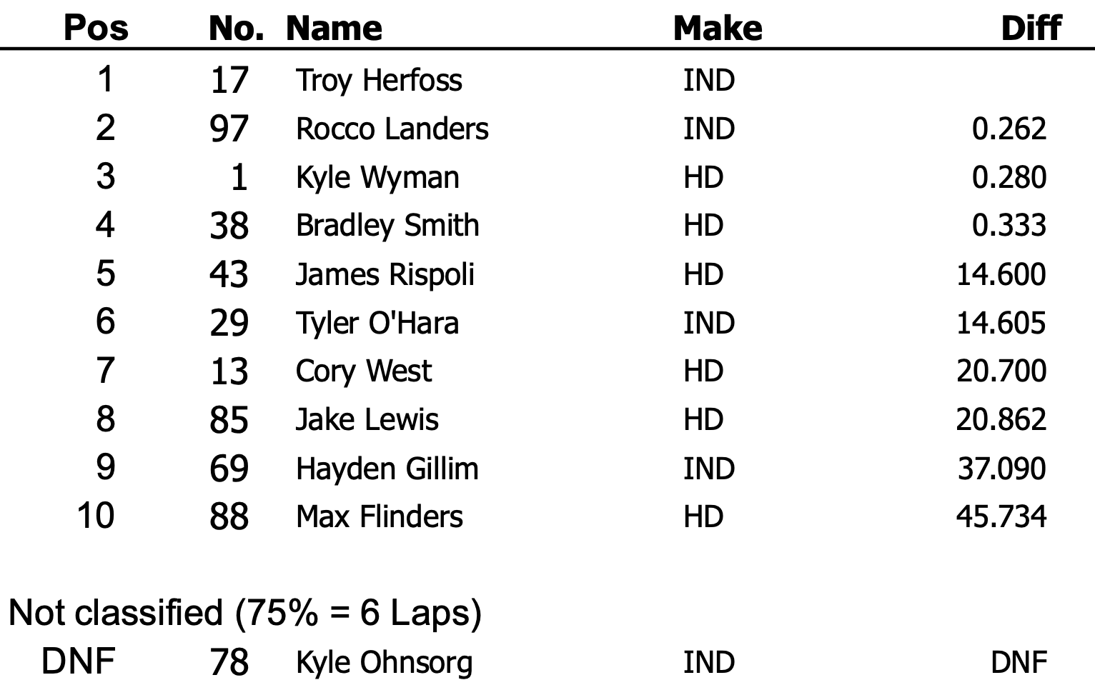 Landers termine deuxième, Wyman troisième, Smith quatrième. Les quatre premiers ont franchi la ligne d’arrivée à seulement 333 millièmes d’intervalle. Pour Herfoss, cette victoire consacre l’efficacité du travail hivernal mené autour du moteur Powerplus. Le succès place d’ailleurs Indian en position de force dans la course au titre.