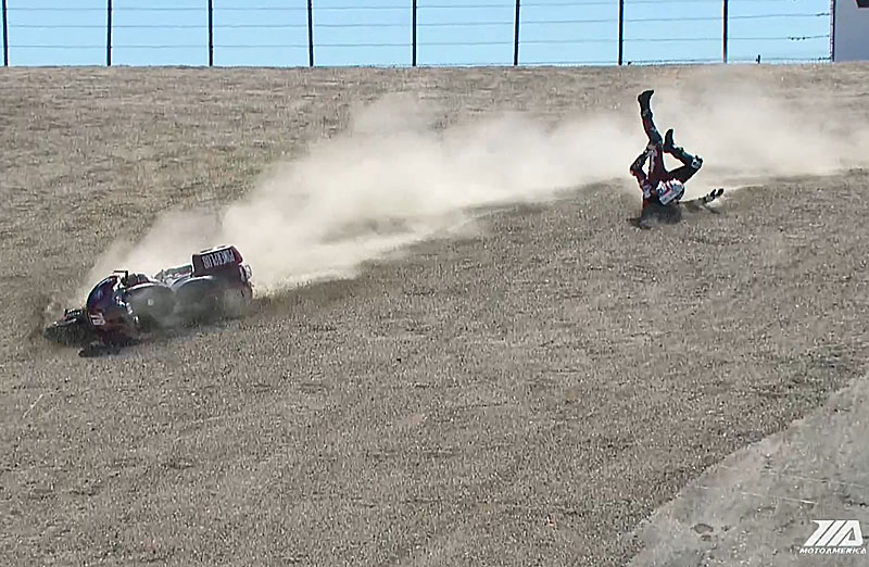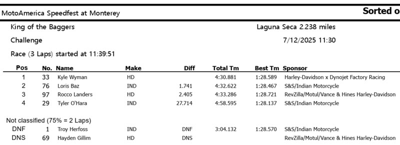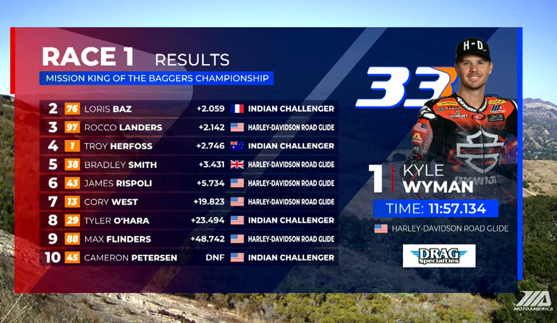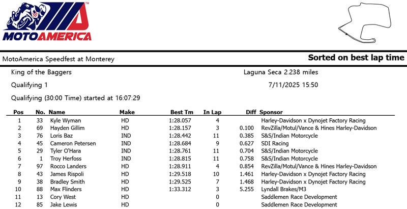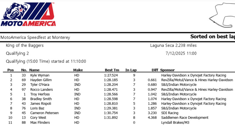La veille, au terme d’une séance de qualification quelque peu atypique, Kyle Wyman (Harley-Davidson x Dynojet Factory Racing) avait placé la référence à 1’28.057 à Monterey, un chrono au millième près égal a celui réalisé par Hayden Gillim (RevZilla/Motul/Vance & Hines Harley Davidson) lors de la première séance d’essais, alors que Loris Baz (S&S/Indian Motorcycle) se plaçait 3e.