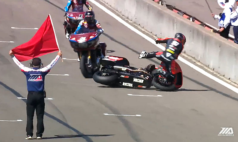 Immédiatement après l’extinction des feux rouges, Tyler O’Hara lève la main car son Indian ne fonctionne pas correctement.