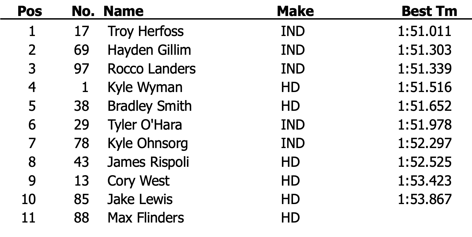 Le J&P Cycles / Motul / Vance & Hines Factory Indian Team a monopolisé les trois premières positions, séparées d’à peine trois dixièmes de seconde. En tête, Troy Herfoss a pris les commandes avec un temps en 1:51.011, faisant preuve d’une adaptation express à la catégorie. Derrière lui, ses coéquipiers Hayden Gillim et Rocco Landers complètent le podium provisoire, consolidant une domination collective qui place Indian en position de force avant la deuxième séance de qualification du King Of The Baggers Challenge.
