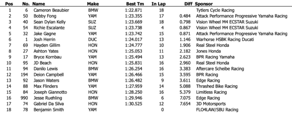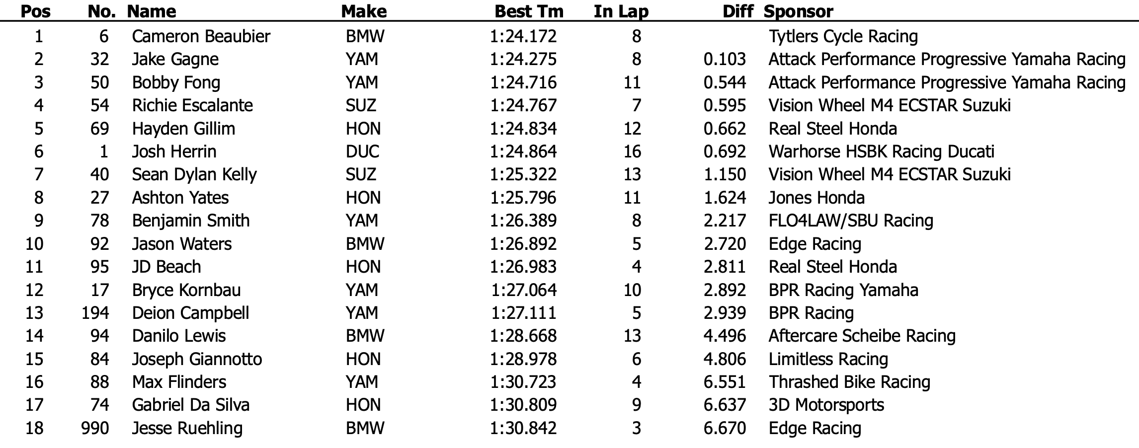 Le champion en titre Josh Herrin, portant pour la première fois le numéro 1 sur sa Ducati Warhorse HSBK Racing Panigale V4 R, a connu des débuts difficiles en se classant sixième à plus d’une seconde de Beaubier. Hayden Gillim (Real Steel Honda) et Ashton Yates (Jones Honda) ont complété le top 8 avec leurs Honda CBR1000RR-R SP respectives. Bryce Kombau (BPR Racing Yamaha) et JD Beach (Real Steel Honda) ont clôturé le top 10.
