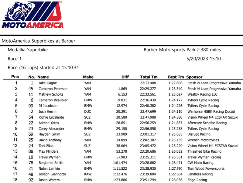Samedi, la deuxième manche du championnat MotoAmerica Superbike, au Barber Motorsports Park de Birmingham en Alabama, a continué dans la même tonalité que la veille, le champion en titre Jake Gagne (Fresh N Lean Progressive Yamaha Racing) dominant le plateau de la tête et des épaules.