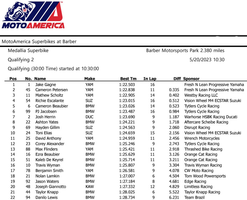 Dans la qualification 2, la concurrence améliorait ses chronos du vendredi après-midi, mais l’officiel Yamaha, bien que moins rapide que l’an passé, faisait de même et conservait un avantage similaire de 0,335s, cette fois sur son propre coéquipier Cameron Petersen. Derrière les deux Yamha bleues, Mathew Scholtz (Westby Racing LLC) venait compléter une première ligne entièrement constituée de R1.