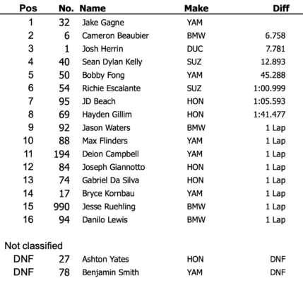 Richie Escalante (Suzuki) s’est classé sixième après avoir abandonné lors de la première course. JD Beach (Honda) a terminé septième et s’est à nouveau imposé dans la Superbike Cup, une compétition parallèle pour les motos Stock 1000. Hayden Gillim (Honda) a connu des difficultés avec une chute mais a réussi à remonter pour finir huitième.