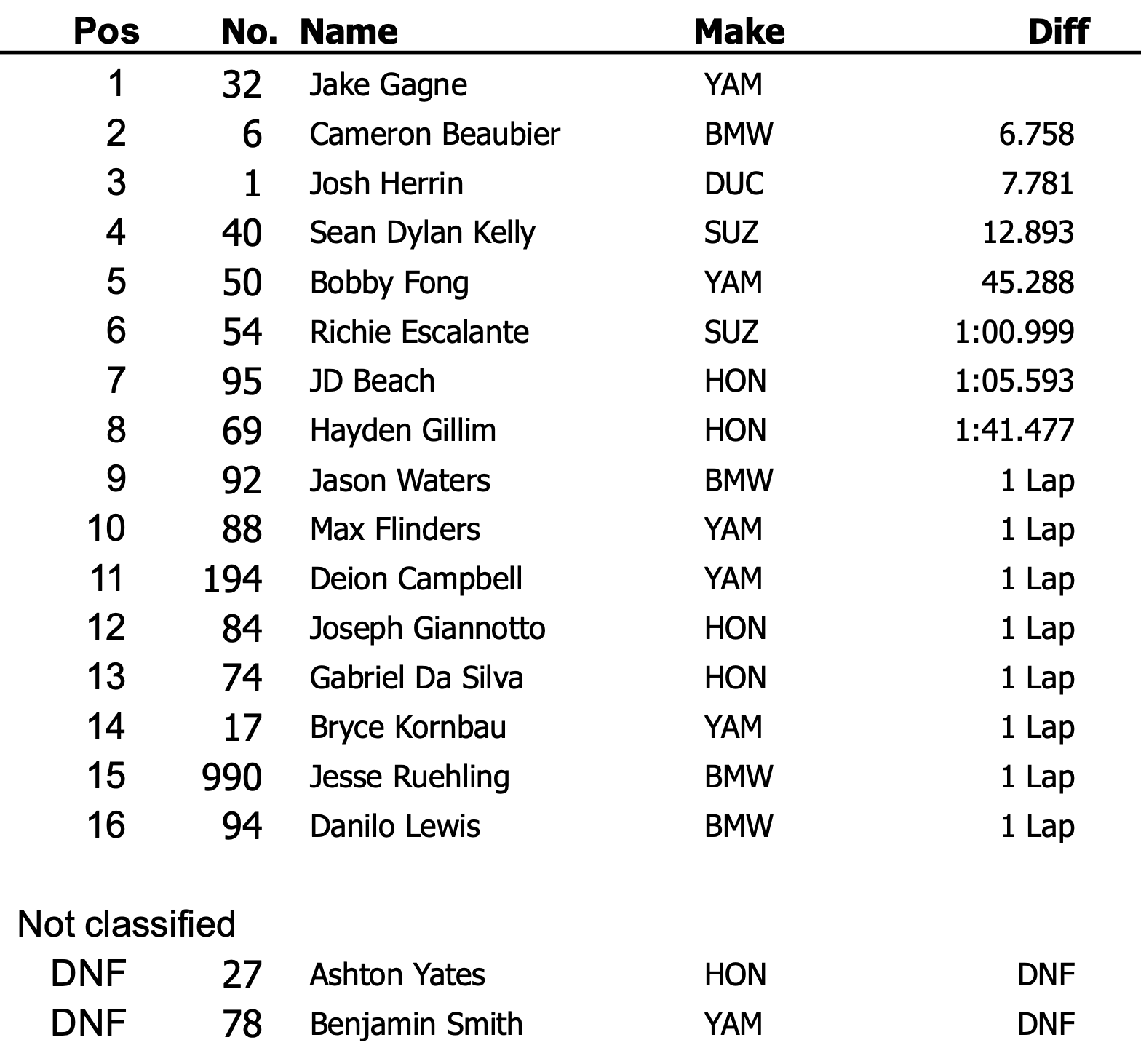Jason Waters (BMW) et Max Flinders (Yamaha) ont complété le top 10. Parmi les non-finishers notables figurent Ashton Yates (Jones Honda) et Benjamin Smith (FLO4LAW/SBU Racing), tous deux victimes d’accidents distincts.