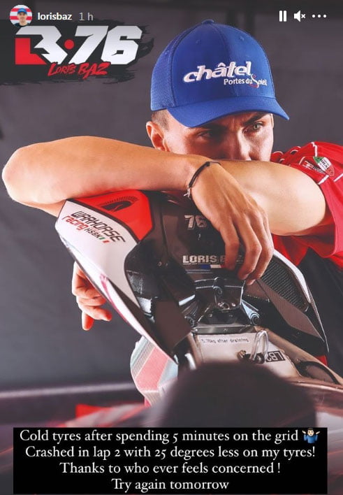 L’explication de ces chutes ? Loris Baz vous la donne lui-même:  » pneus froids après avoir passé 5 minutes sur la grille. J’ai chuté avec 25 degrés de moins sur les pneus ! Merci à ceux qui se sentent concernés ! On essaiera à nouveau demain. »