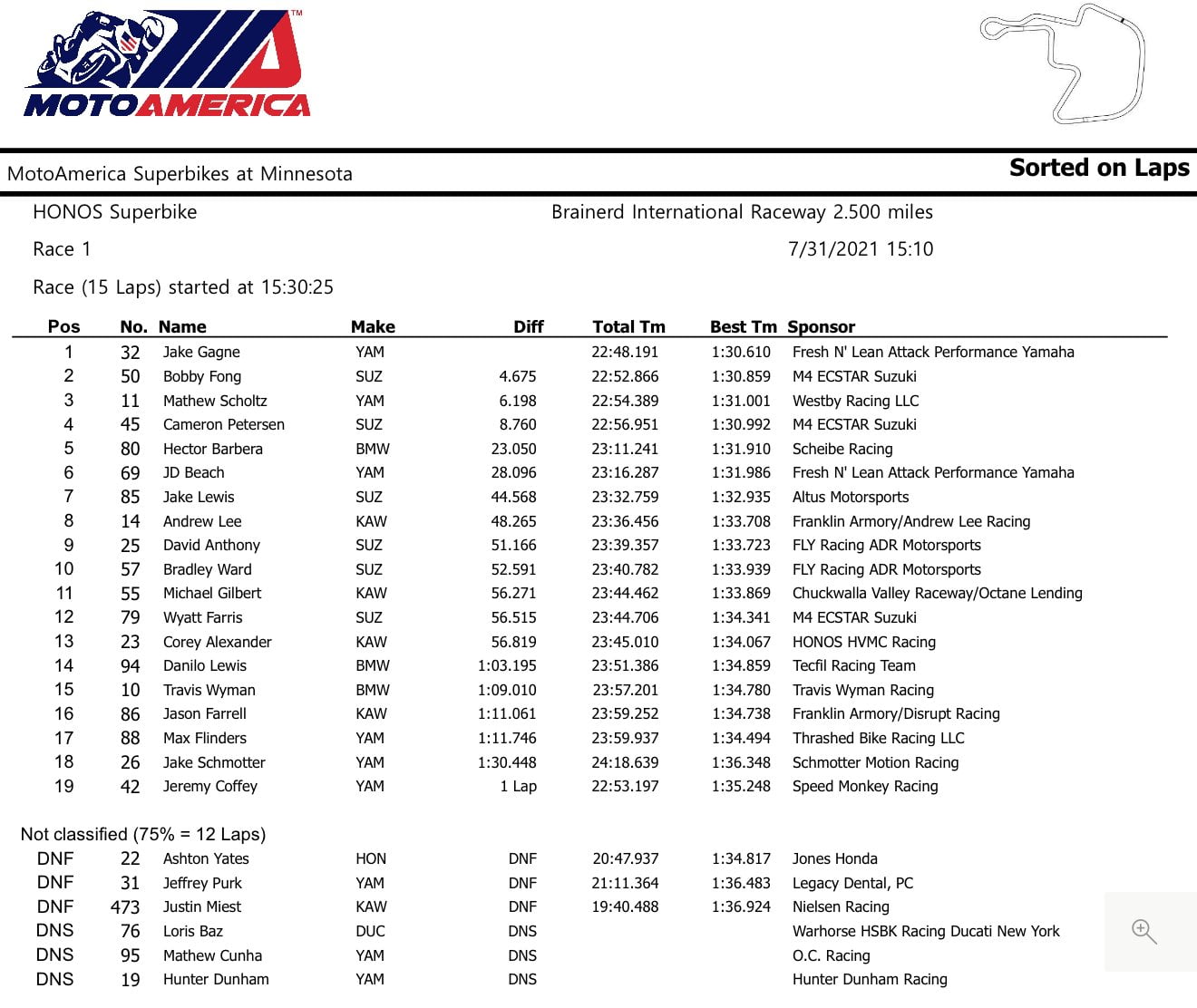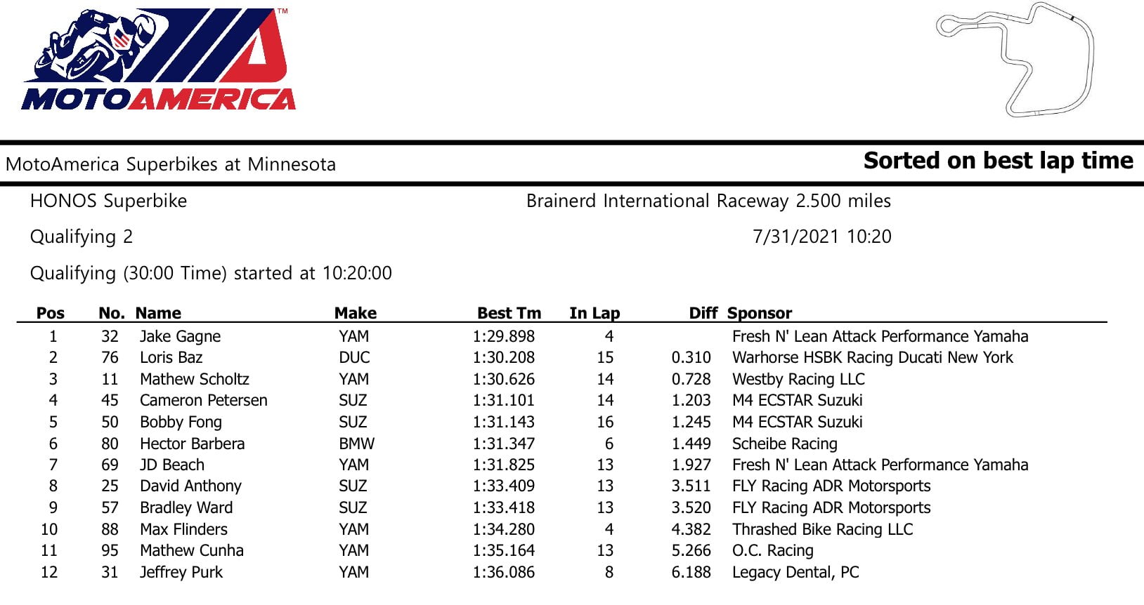 Jake Gagne,  Attaque Fresh N’ Lean Performance Yamaha Racing : « C’était une course folle ! Dans la première course, j’ai fait une erreur dans le virage 3 et j’ai perdu l’arrière. Heureusement, je me suis glissé sous la moto et j’ai pu la ramener aux stands après le drapeau rouge. L’équipe a fait un travail fantastique en réparant la moto juste à temps, et nous avons pu revenir sur la piste pour nous battre à nouveau. J’ai fait quelques tours propres après le redémarrage et j’ai pu ramener à la maison une autre victoire pour cette équipe et cette machine géniales. »