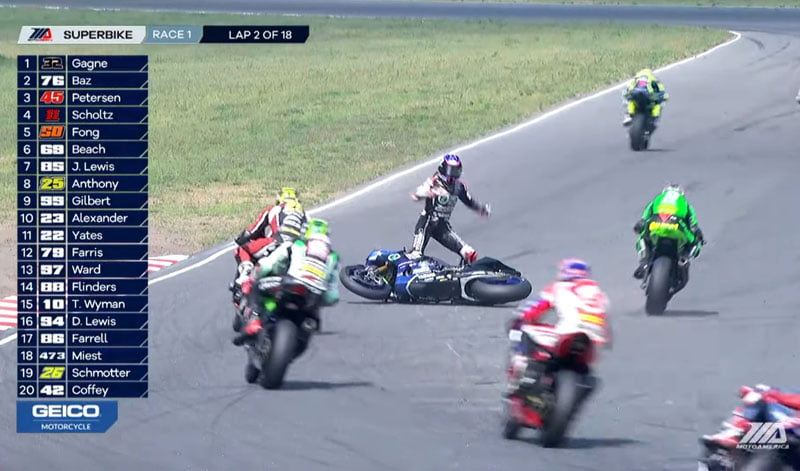 Dans la foulée, Jack Gagne partait à la faute et sa moto immobilisée au milieu de la piste entraînait l’arrêt de la course au drapeau rouge. Malheureusement, Loris Baz, alors leader, connaissait le même sort au virage suivant, avec plus de conséquences puisque la Ducati Panigale fortement endommagée du Français ne pouvait prendre le deuxième départ, contrairement à la Yamaha de Jack Gagne qui alignait son 10e succès consécutif devant Bobby Fong (M4 Ecstar Suzuki) et Mathew Scholtz (Westby Racing LCC).