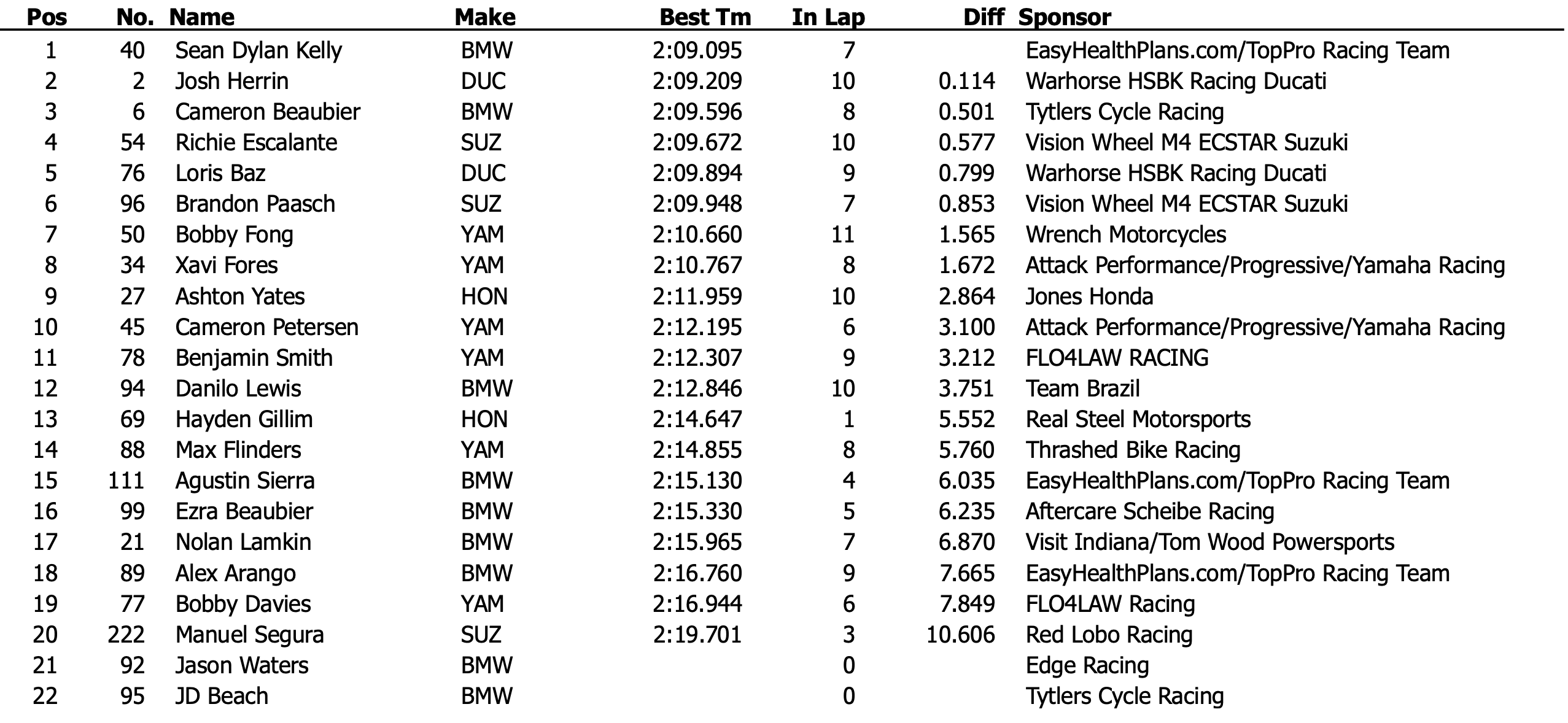 Cameron Beaubier était troisième au terme de cette séance, avec un temps de 2:09.596. Le Français, Loris Baz, a complété la séance avec un top-5. Le Tricolore était malgré tout huit dixièmes plus lent que Sean Dylan Kelly.
