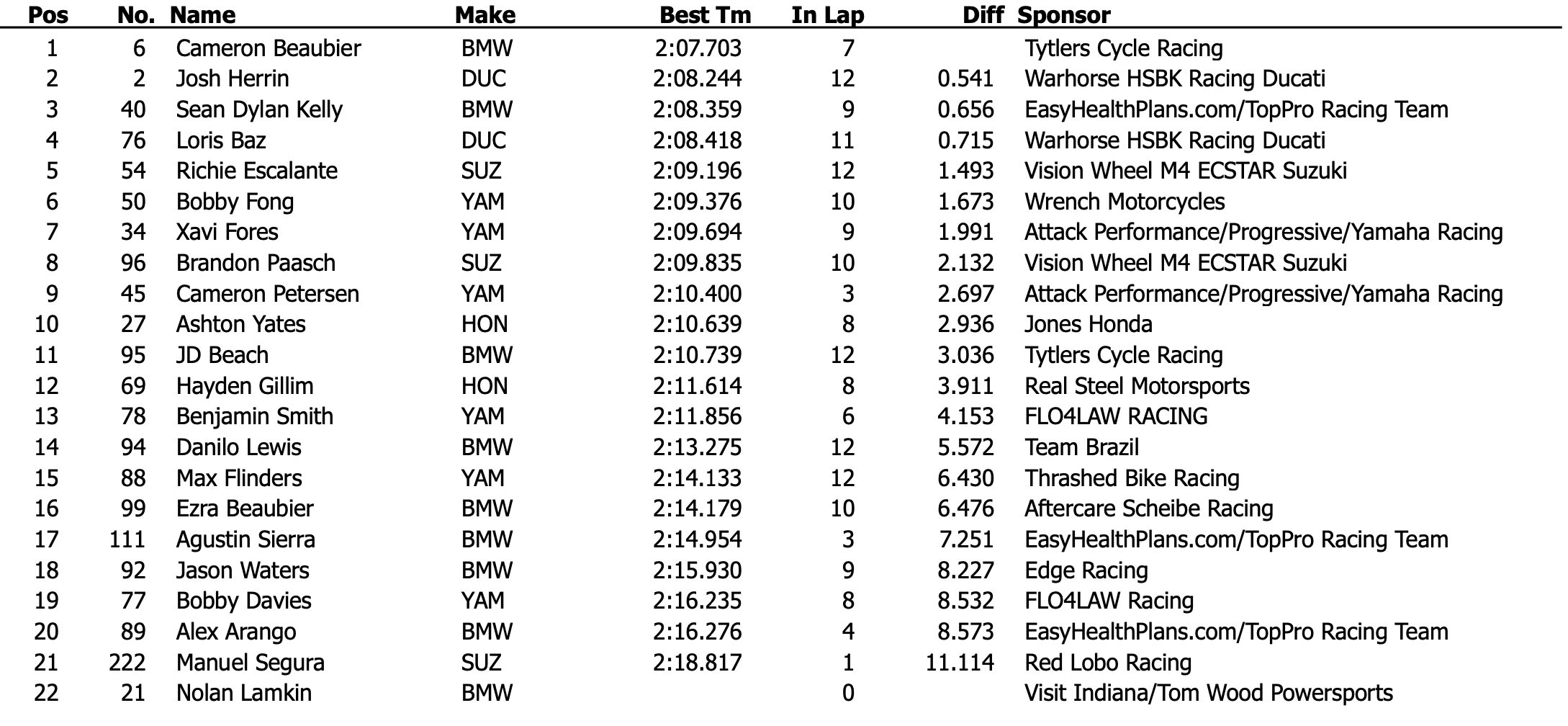 Discret dans la matinée, Cameron Beaubier s’est réveillé lors des essais, pour s’emparer de la pole position provisoire après avoir claqué un temps en 2:07.703, qui n’a laissé aucune chance à la concurrence. Un temps qui lui a permis d’éclipser le précédent record du tour de 2:08.169, jusque-là détenu par Jake Gagne. Le pilote BMW devance ainsi la Ducati de Josh Herrin de plus d’une demie seconde.