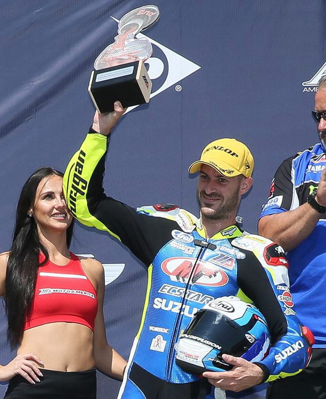 Valentin Debise: « Comme depuis 3 ans, je cours dans le même team M4 Suzuki Ecstar, en 600cc Supersport dans le championnat MotoAmerica, anciennement AMA. Cette année, je me suis fait mal à Daytona lors d’une course préparatoire et j’ai raté les 2 week-ends de courses suivantes au championnat. À mon retour, j’ai gagné la première course que j’ai faite avant d’enchaîner pas mal de podiums, dont une 2e victoire le week-end dernier lors de la première course à Pittsburgh. Pour le moment, je suis remonté à la 3e place du classement général, après avoir raté 2 week-ends de course, donc 4 courses ».