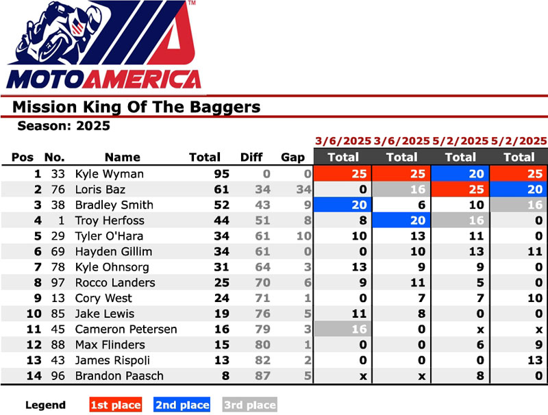 Après quatre courses, deux à Daytona et deux à Road Atlanta, Kyle Wyman (Harley-Davidson x Dynojet Factory Racing) mène le championnat 34 points devant Loris Baz (S&S/Indian Motorcycle).