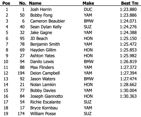 Cameron Beaubier (Tytlers Cycle Racing) s’est également illustré, ne concédant que 0,185 seconde à Fong. Sean Dylan Kelly (Vision Wheel M4 ECSTAR Suzuki) et Jake Gagne, coéquipier de Fong, complètent le top-5, tous regroupés en moins d’une demi-seconde.