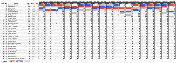 Le classement final consacre Beaubier avec 371 points, soit 25 unités d’avance sur Herrin (346) et 32 sur Fong (339). Gagne et Kelly ferment le top 5 d’un championnat où l’incertitude a duré jusqu’à la dernière course.