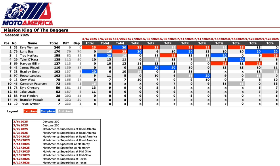 Solide deuxième du classement général à 70 points du leader, Loris Baz et son Indian Officielle ne peut certes plus rien contre Kyle Wyman, mais il doit défendre sa position contre ses coéquipiers, le champion Mission King Of The Baggers 2024 Troy Herfoss et Tyler O’Hara (S&S/Indian Motorcycle), ainsi qu’Hayden Gillim (RevZilla/Motul/Vance & Hines Harley-Davidson).