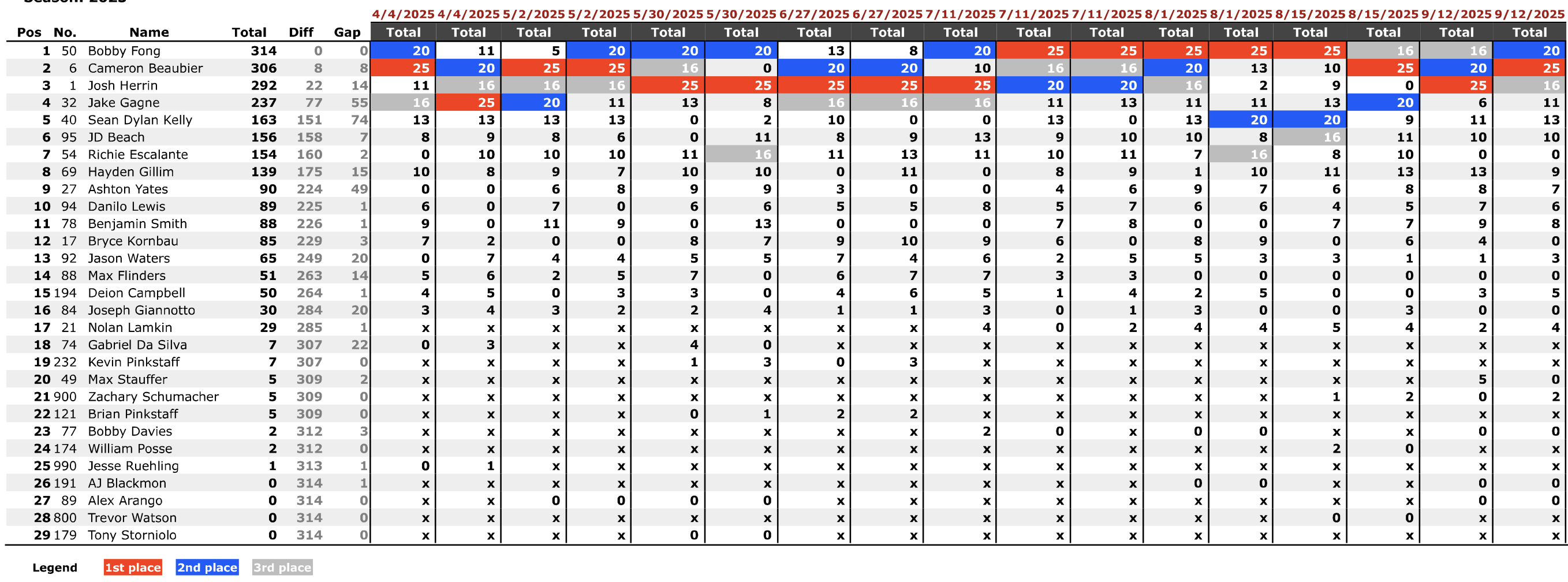 Huit petits points séparent Fong de Beaubier, tandis que Herrin accuse un retard de 22 unités. Avec trois courses au programme et 75 points en jeu, tout reste possible. De plus, le circuit du New Jersey a la réputation d’offrir des scénarios imprévisibles, entre météo capricieuse et fortunes diverses.