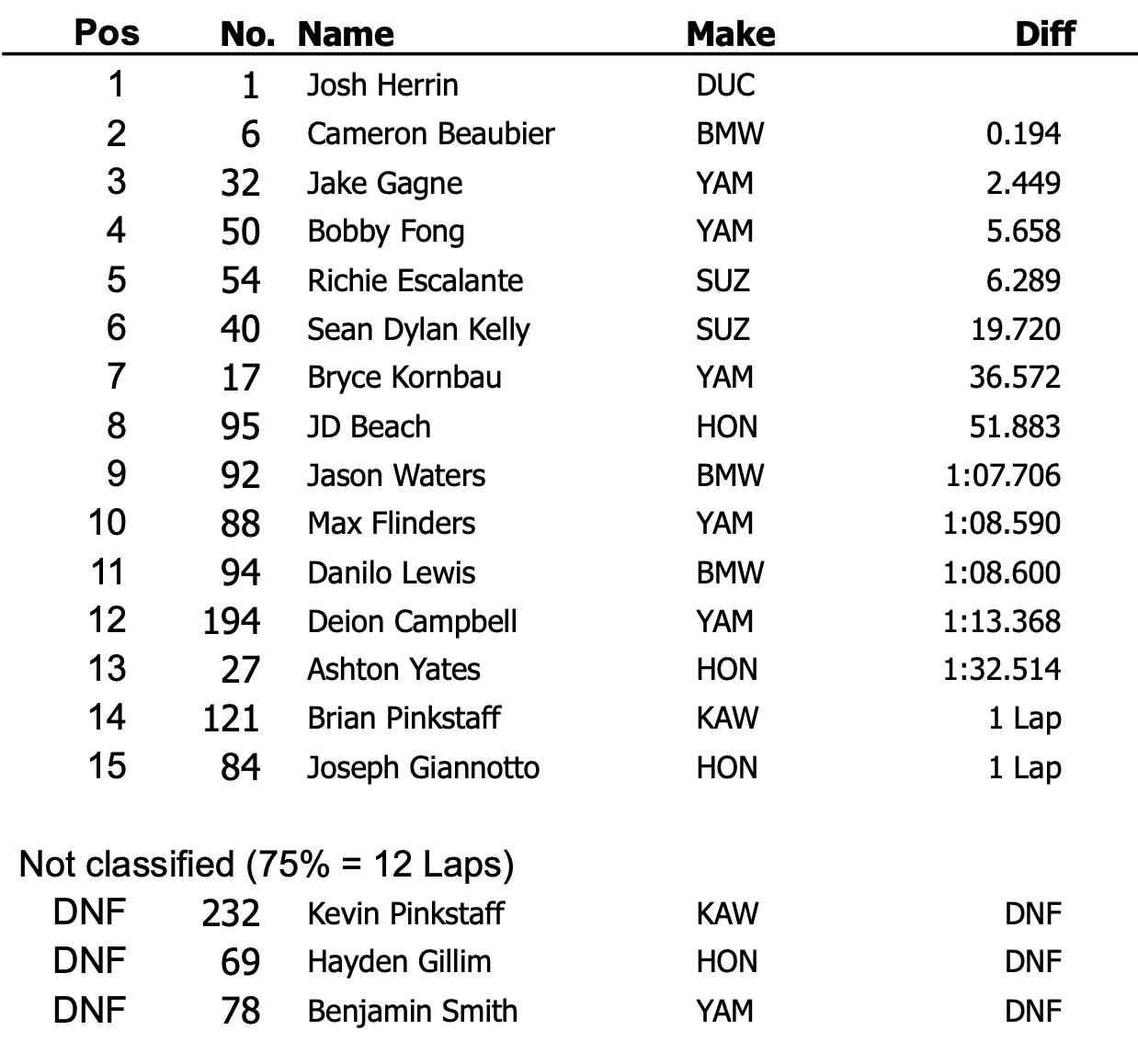 À l’arrivée, Herrin a franchi la ligne en vainqueur, avec seulement 0,194 seconde d’avance sur Beaubier. Cette victoire lui permet de prendre la tête du championnat avec trois points d’avance sur son rival. Avec cette 19e victoire en carrière, Josh Herrin accède d’ailleurs à la neuvième place du classement des pilotes les plus victorieux de l’histoire de Superbike MotoAmerica.