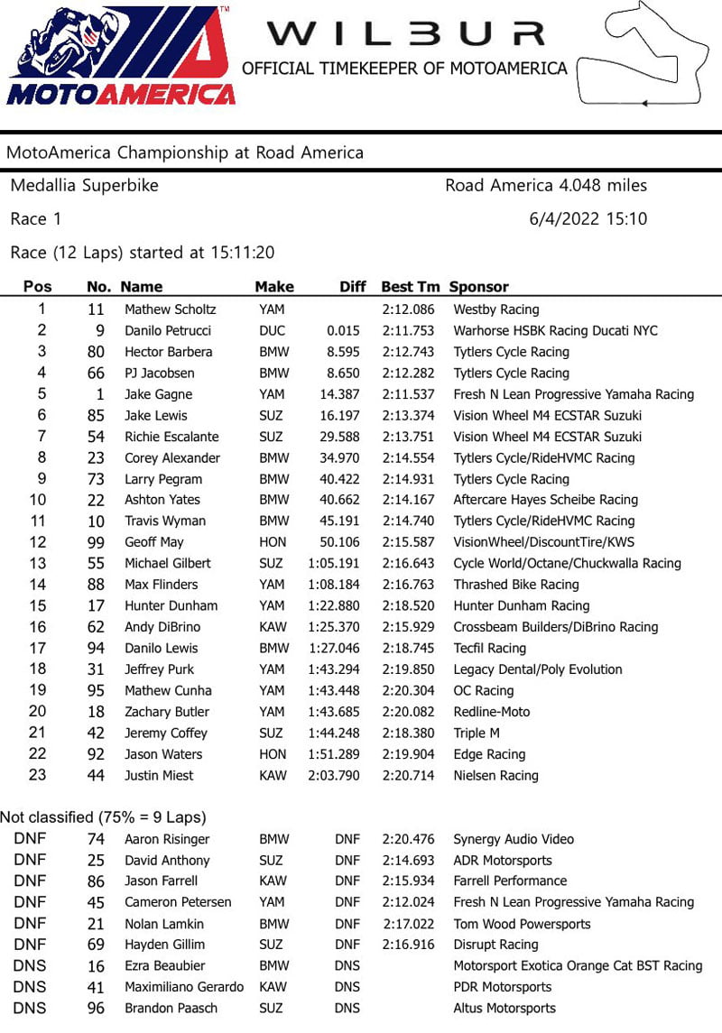 À la mi-course, Petrucci était de retour dans le jeu pour la victoire, lorsque la Yamaha de Cameron Petersen a soudainement chuté, mettant le Sud-Africain, à ce moment-là en tête, hors jeu. Petrucci et Scholtz ont dû jouer pour la victoire. Dans la ligne droite, la Ducati est un missile, mais la Yamaha avait un petit avantage dans la partie la plus sinueuse de Road America. Verdict du dernier tour : Scholtz est entré en force dans le cinquième virage, et a essayé de se débarrasser de Danilo avec un block pass. En sortant du dernier virage comme une fusée, le Ducatista a tenté sa chance sous le drapeau, mais cela n’est pas passé pour lui : il ne lui manquait que quinze millièmes de seconde. Le podium a été complété par Héctor Barberá sur la BMW.