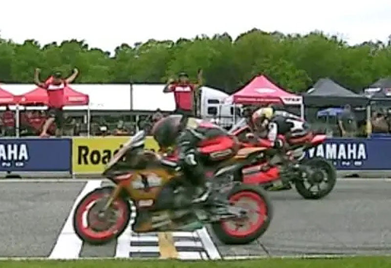 Danilo Petrucci (Warhorse HSBK Racing Ducati NYC) nargué par Mathew Scholtz (Yamaha Westby Racing) à l’arrivée de la course 1 à Road America. Jake Gagne (Fresh N Lean Progressive Yamaha) chute et récupère la cinquième place.