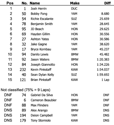 La course n’a pas été de tout repos pour tout le monde. Jake Gagne (Yamaha), coéquipier de Fong, a été impliqué dans un accrochage avec Sean Dylan Kelly (Suzuki), qui a ruiné la course des deux hommes. Gagne termine huitième, Kelly quatorzième.