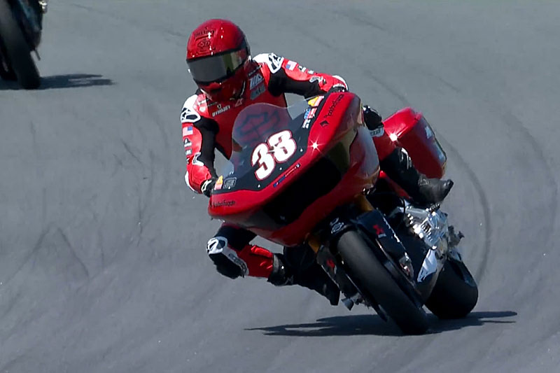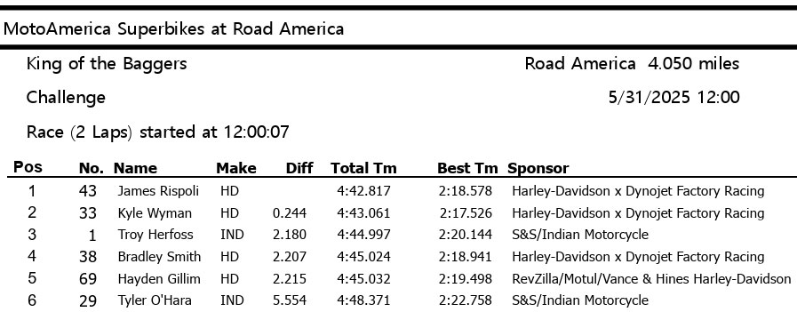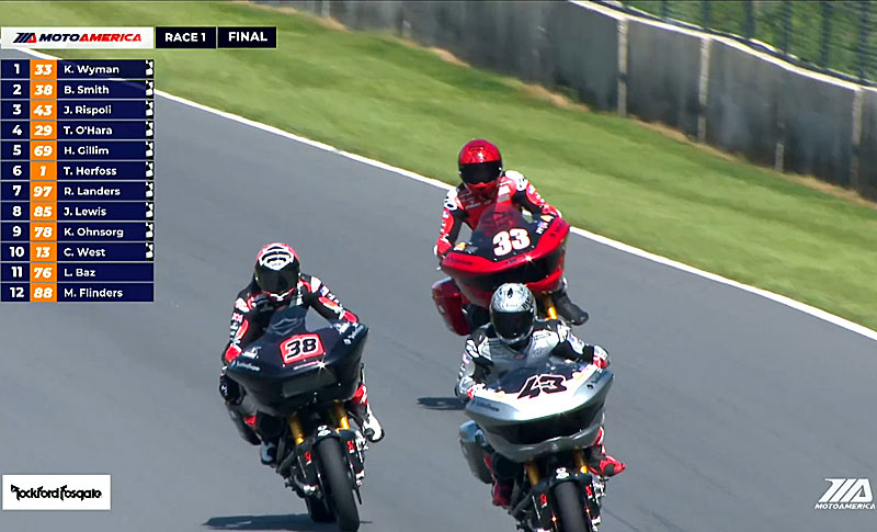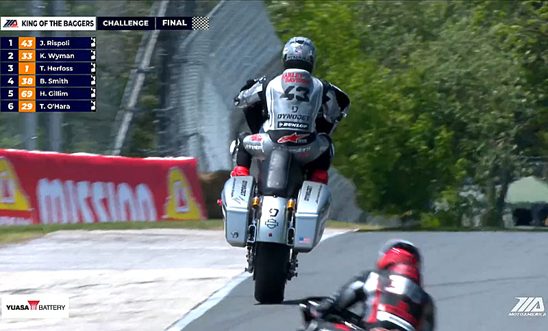 Le leader du championnat s’est bien élancé mais s’est rapidement fait doubler par Troy Herfoss, puis James Rispoli, au guidon de sa Road Glide argentée, a profité d’une aspiration pour prendre le leadership et ne plus le lâcher malgré le retour de Kyle Wyman à 260 km/h !