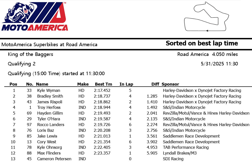 Le champion en titre Troy Herfoss (S&S / Indian Motorcycle) prenait d’abord le commandement mais devait s’incliner devant Kyle Wyman (Harley-Davidson x Dynojet Factory Racing) à la mi-séance, avant que celui-ci ne batte le record de la piste en 2’17.919.